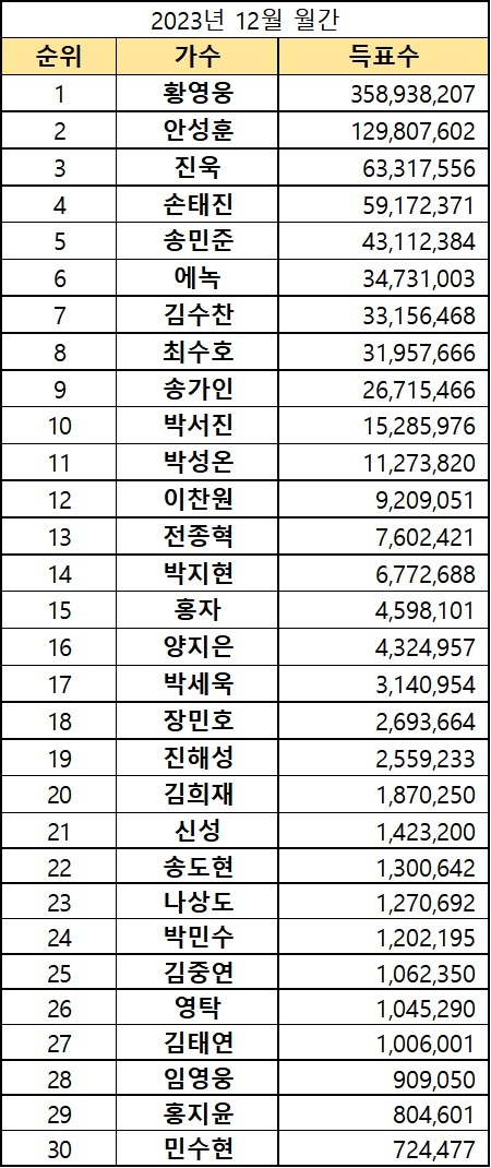 2023년 12월 월간랭킹에서는 황영웅이 358,938,207표를 얻으며 1위를 차지했다. 2위는 129,807,602표를 얻은 안성훈, 3위는 63,317,556표를 획득한 진욱, 4위는 59,172,371표의 손태진, 5위는 43,112,384표의 송민준으로 각각 집계됐다.