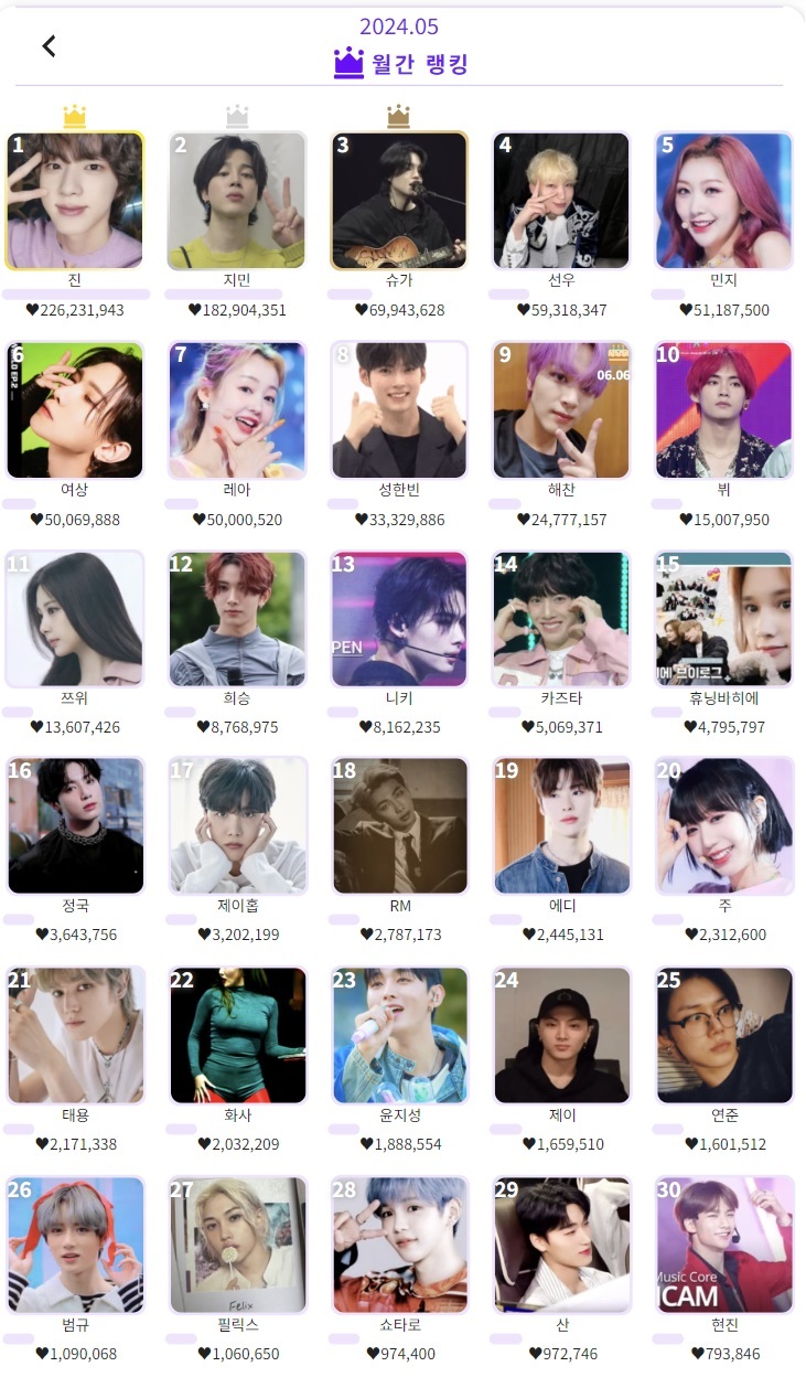 2024년 5월 월간랭킹에서는 BTS 진이 226,231,943표를 얻으며 1위를 차지했다. 2위는 182,904,351표를 얻은 BTS 지민, 3위는 69,943,628표를 획득한 BTS 슈가로 각각 집계됐다.
