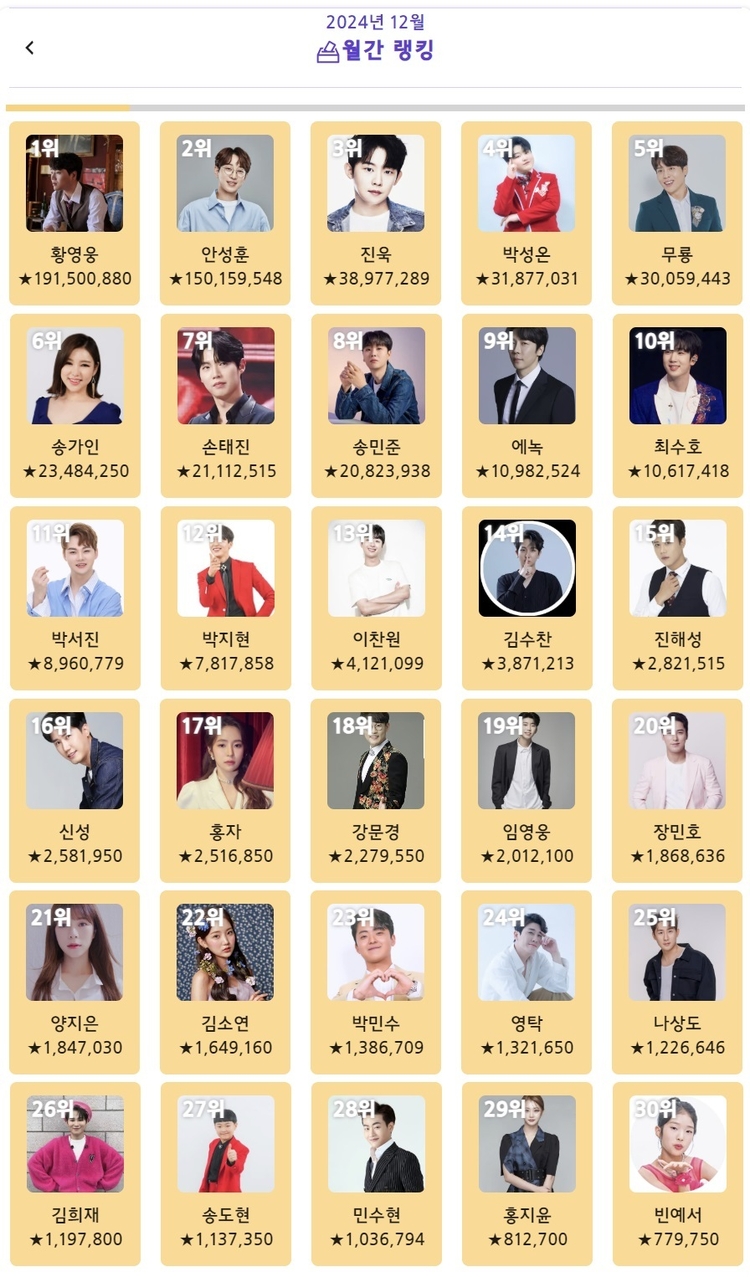 2024년 12월 트롯스타 월간 랭킹에서는 황영웅이 191,500,880표를 기록하며 1위에 올랐다. 2위는 150,159,548표를 받은 안성훈, 3위는 38,977,289표를 얻은 진욱이 각각 차지했다. 박성온과 무룡은 각각 31,877,031표와 30,059,443표로 4위와 5위에 이름을 올렸다.